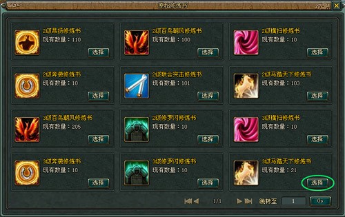 在原始修炼书下方,我们点击“选择”进入到包裹界面,可以看到自己目前所有用的技能修炼书和数量: