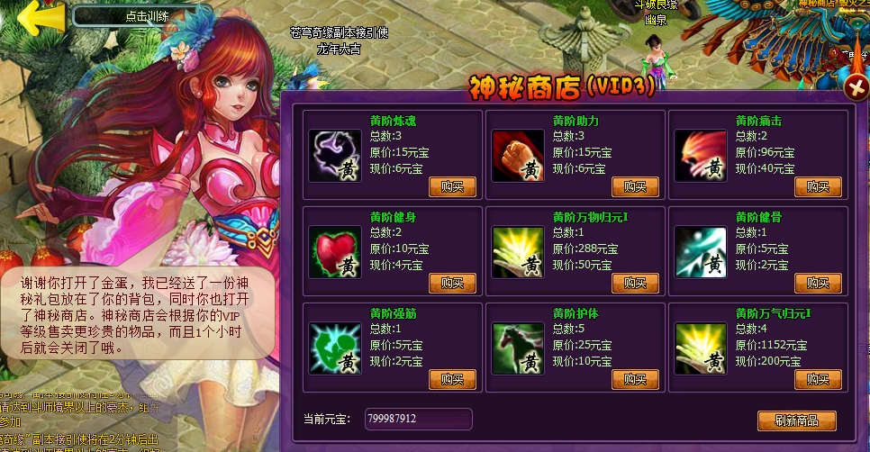 1、优化了神秘商店,商店中不再售卖属性丹,改为出售伙伴技能书,只能通过非绑定元宝购买。同时商城对应的伙伴技能书道具也将下架;取消了属性吞噬界面,原有的从神秘商店中购买的属性丹依然可以吞噬,但游戏中将不再产出属性丹。