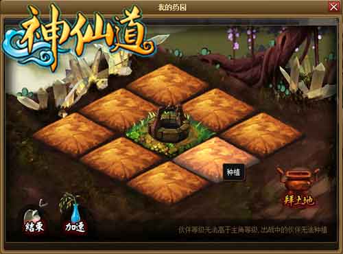 陪游神仙道药园种植有两种模式,一种是种经验树,另一种是种发财树。
